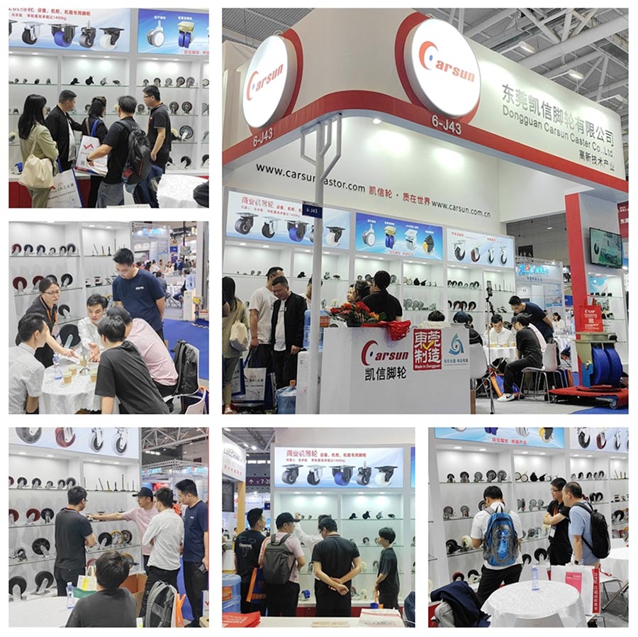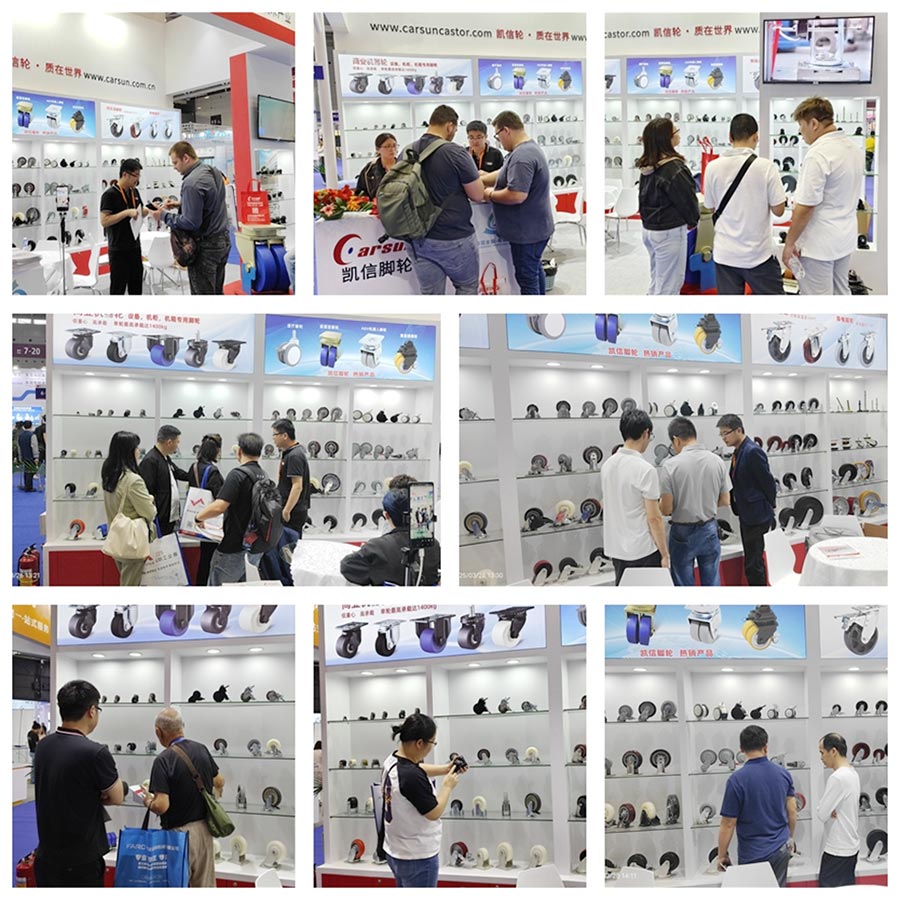 在具体产品展示中,凯信[Carsun]脚轮的重型聚氨酯万向轮吸引了众多参观者的目光。这些轮子尺寸涵盖 2寸、3寸、4寸、5寸、6寸、8寸等,轮芯材质有塑芯、铁芯、铝芯、钢芯、304不锈钢芯等多种选择。并且,可搭配双滚珠轴承、特尔灵轴承或滚柱轴承等,满足不同AGV机器人应用场景的特殊需求。